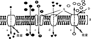 问题 下图为物质出入细胞膜的示意图.请据图回答: (1)A代表__________分子;B代表__________;D代表__________。 (2)细胞膜从功能上来说,它是一层__________膜。 (3)动物细胞吸水膨胀时B的厚度变小,这说明B具有 __________ 。 (4)在a—e的五种过程中,代表被动运输的是__________。 (5)可能代表氧气转运过程的是图中编号 __________ ;碘进人人体甲状腺滤泡上皮细胞的过程是图中编号__________。
