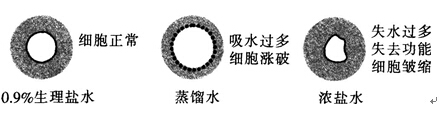 解析 【知识点】本题考查细胞内水、无机盐的功能以及细胞吸水和失水。 【答案】D。 【解析】示意图表明,0.9%的生理盐水能维持细胞的正常形态和功能.在蒸馏水或浓盐水中红细胞变形失去正常功能,说明水分和无机盐对于维持细胞的形态和功能有重要作用.D正确。