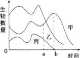 下图表示某草地上草、虫、鸟三类生物数量的变化曲线,下列叙述正确的是(  )。 A.甲、乙、丙依次是鸟、虫、草 B.a点时丙数量的上升主要是食物的增加 ...