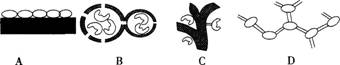 解析 【知识点】本题考查酶的研究与应用。 【答案】B。 【解析】A表示吸附法,B表示包埋法,C、D表示结合法。固定酵母细胞多采用包埋法,细胞分子个大.难以被吸附或结合,故选B。
