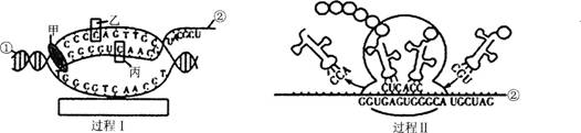 如图表示发生在真核细胞内的两个生理过程,请据图回答问题: (1)过程I中甲的名称为 __________,乙与丙在组成上的不同之处在于乙含 ___...