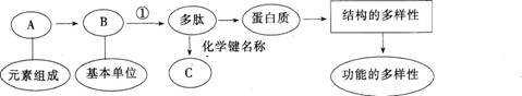如图是表示有关蛋白质分子的简要概念图。下列对图示的分析正确的是(  )。 A.A中肯定含有S元素 B.①过程是利用细胞中的原料合成的 C.多肽中B的...