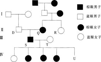 解析 【知识点】本题考查基因的显性和隐性以及它们与性状表现之间的关系的相关知识。 【答案】B。 【解析】由图示可知,两个棕眼的人生的子女中有的是棕眼,有的是蓝眼,说明棕眼是显性性状。S是棕眼,而Ⅳ中有女儿的眼是蓝眼,所以控制眼色的基因位于常染色体上。所以Q是杂合子。基因型为Bb,故选B。