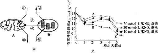 如图甲表示甜樱桃植物细胞内A、B两种细胞器进行的代谢过程模式。为研究淹水时KN03对甜樱桃根呼吸的影响,设四组盆栽甜樱桃,其中一组淹入清水,其余三组分别淹...