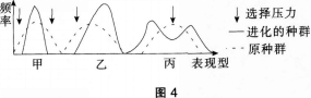 图4中甲、乙、丙表示自然选择对种群的三种作用类型,其中最易产生新物种的是(  )。 A.甲 B.乙 C.丙 D.甲、乙