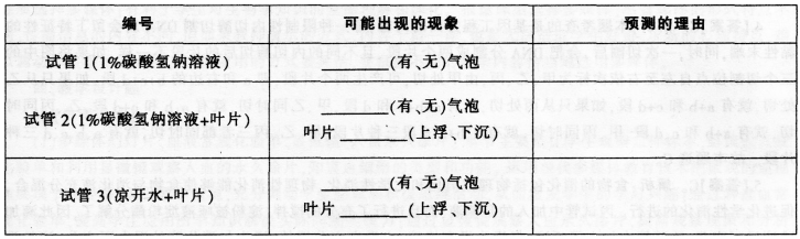 问题 在“光合作用吸收二氧化碳释放氧气”一节中,某教师安排了实验:“二氧化碳是光合作用必需的原料吗?”实验过程如下: (一)提出问题 二氧化碳是光合作用必需的原料吗? (二)作出假设 二氧化碳是光合作用必需的原料。即没有二氧化碳植物就不能进行光合作用。 (三)制订并实施计划 1.准备3个干净试管。并分别标号1、2、3。向试管1、2、3中分别加入等量的l%碳酸氢钠溶液、1%碳酸氢钠溶液、凉开水,并盖好橡皮塞。 2.打开试管2的橡皮塞,放入一片菹草叶子,再马上把橡皮塞塞好。(注意:管内的液体很满,小心操作,尽量不要让液体流出) 3.打开试管3的橡皮塞,放入一片同等大小的菹草叶子,也马上把橡皮塞塞好。(注意:管内的液体很满,小心操作,尽量不要让液体流出) 4.把1、2、3号试管同时放到灯光下照射几分钟,检查三个试管中有无气泡产生,叶片是上浮还是仍然沉在水底。 实验结果预测: 表一:…… 结果记录与分析: 表二:…… (1)对比试管1与试管2可以发现:…… (2)对比试管2与试管3可以发现:…… (四)得出结论 二氧化碳(是\不是)光合作用必需的原料。 原假设(成立\不成立)。 问题: (1)分析上述材料,设计表一及表二。(18分) (2)在组织该实验时,教师应注意什么?(12分)