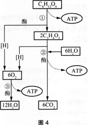 图4是高等动物有氧呼吸过程的图解。 问题: (1)观察图4中的反应过程,其化学反应式为__________。(3分) (2)该反应...