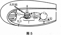 图5为叶绿体中光合作用过程示意图 问题: (1)图中的①结构上分布有__________和相关的酶,可以将光能转化为__________。(6...