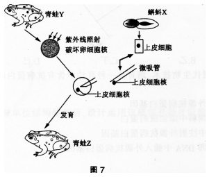 问题 实验人员从蝌蚪x体内取得上皮细胞,又从同种青蛙Y体内取得卵细胞并去掉其细胞核:之后取出蝌蚪上皮细胞的细胞核植入去核的青蛙卵细胞;最终这颗卵细胞发育成青蛙Z,图7为该实验过程示意图。 问题: (1)该实验采用的技术属于现代生物技术中的_________工程,图7中将蝌蚪细胞核植入去核的青蛙卵细胞时,所使用的技术是_________。 (2)青蛙Y体细胞染色体数目是青蛙Z的_________(1/2/4)倍。 (3)青蛙Z与蝌蚪X发育后的青蛙具有相同的特征,说明生物体形态结构的建成主要与有关。 (4)在细胞培养的过程中,要控制传代培养的次数,避免细胞突破接触抑制,发生_________(衰苦/癌变/凋亡)。