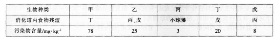 问题 对某池塘中的甲、乙、丙、丁、戊五种生物进行研究。分析它们消化道内食物残渣组成以及体内某种主要污染物含量,结果见下表。 关于这五种生物营养关系的表述最合理的是( )。