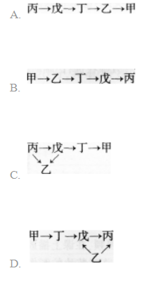 解析 根据污染物含量的多少以及消化道内食物残渣组成可判断出其捕食关系。丙以小球藻为食,属于初级消费者。丙被戊和乙所食,戊又被丁和乙所食。根据生物富集原理,污染物会随着食物链不断累积,其中甲体内的污染物含量最高.属于最高级消费者,其主要食物是丁。丁与乙体内污染物含量相近,不存在明显的捕食关系。故能正确表现这五种生物营养关系的是C选项。