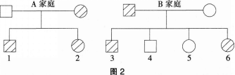 图2是A、B两个家庭的色盲遗传系谱图,A家庭的母亲是色盲患者(图中①),这两个家庭由于某种原因调换了一个孩子,请确定调换的两个孩子是(  )。 A.1...