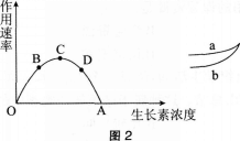如图2所示,如果茎a侧生长素在B点以下的浓度范围内,下列b侧生长素浓度范围的描述哪项较为准确(  )。 A.在OA段范围内 B.在BC段范围内 C...
