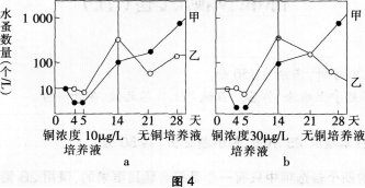 图4表示铜污染对形态、结构和生理特征相似的甲、乙两种水蚤的影响。a,b分别表示将两种水蚤培养在不同铜浓度培养液,然后培养在无铜适宜培养液而获得的数量变化曲...