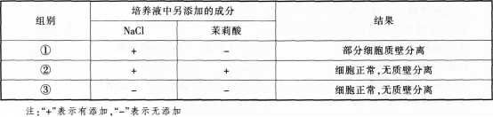 解析 实验的自变量为是否加入NaC1和荣莉酸,因变量是细胞发生质壁分离的情况,③为对照组.由表数据可知茉莉酸有抑制质壁分离的作用。故选D。