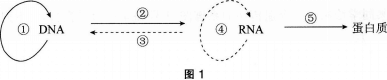 图1为中心法则图解,下列有关的叙述中,正确的是(  )。 A.过程③发生在所有RNA病毒中 B.转基因生物中能够体现①~⑤过程 C.①一⑤过程...