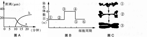 解析 (1)分别移向两极的染色体着丝点之间的距离 (2)10;②③;4n (3)①②;前期; 解析: (1)图A中曲线a表示染色体的着丝点与纺锤丝的相应极之问的平均距离.结合染色体在细胞分裂过程中的行为特征,可推知曲线b表示分裂后期染色体之间的距离。 (2)由图A可知10分钟后细胞分裂进入后期,相当于B图中的②③段。有丝分裂后期细胞中染色体数目最多,依据图示可知为4n。 (3)图c中①~②为DNA复制时期,对应图B的①②,图c中②~③染色质变成染色体,该变化发生在有丝分裂的前期,①是染色质、③是染色体,两者是同一种物质在不同时期的两种存在状态。