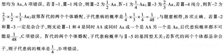 问题 图5为某种单基因常染色体隐性遗传病的系谱图(深色代表的个体是该遗传病患者.其余为表现型正常个体)。近亲结婚时该遗传病发病率较高,假定图中第Ⅳ代的两个个体婚配生出一个患该遗传病子代的概率是1/48,那么,得出此概率值需要的限定条件是(  )。