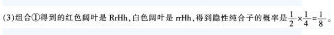 解析 (1)①或③;②;红色 (2)rrHHxRrhh;RrhhxRrhh;rrHHxRRhh (3)1/8 解析:(1)根据组合①或③亲本是阔叶和窄叶但子代全部是阔叶,阔叶最可能是显性,根据组合②亲本是红色,可子代中有白色,说明红色是显性。 (2)根据(1)的显隐性关系,组合①的子代中红色和白色是1:1,说明亲本是rrHHxRrhh,组合②子代中红色:白色=3:1,亲本应是RrhhxRrhh,组合③子代中只有红色阔叶,亲本应是rrHHxRRhh。