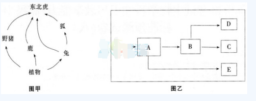 问题 “没有买卖.就没有杀害!”野生东北虎保护受到社会广泛关注。在我国,东北虎的致危因素主要有非法猎杀、栖息地的丧失与破坏、猎物的缺少等。 (1)图甲所示的食物网中共有~条食物链,其中次级消费者是__________。该食物网再加上就可以构成一个完整的生态系统。(6分) (2)东北虎位于食物链的顶端,其领域里必须要有足够多的猎物才能维持其生存和繁衍,因为能量流动具有__________特点。(3分) (3)图乙是能量流经东北虎种群的示意图,其中A表示东北虎的摄入量,B表示东北虎的同化量。那么D、E依次表示东北虎的__________,__________。(4分) (4)东北地区保存有大面积森林,改善栖息环境,以提高__________,野生东北虎种群恢复仍有希望。(2分)