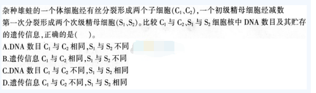 解析 有丝分裂形成的两个子细胞的DNA数目相同。减数第一次分裂形成的两个次级精母细胞的DNA数目相同,C1和C2,S1和S2均相同,A错误;有丝分裂形成的子细胞所含的遗传信息相同,减数第一次分裂,同源染色体分离,非同源染色体自由组合,所形成的两个次级精母细胞遗传信息不同,B正确;同理,C、D错误。