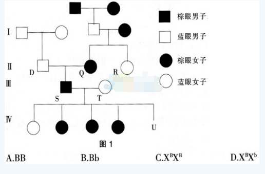 图1表示一家族中眼睛颜色的遗传,若以B和b分别代表眼色的显性和隐性基因,则Q的基因型是()。