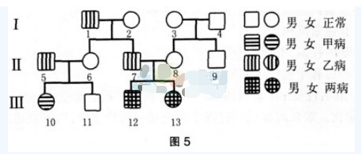 问题 在一个远离大陆且交通不便的海岛上,居民中有66%为甲种遗传病(基因为A、a)致病基因携带者。岛上某家族系谱中,除患甲病外,还患有乙病(基因为B、b),两种病中有一种为血友病,请据图5回答问题: (1)__________病为血友病,另一种遗传病的基因在__________染色体上,为__________性遗传病。(6分) (2)若Ⅲ-11与该岛一个表现型正常的女子结婚,则其孩子中患甲病的概率为 __________ 。 (3分) (3)我国婚姻法禁止近亲结婚,若Ⅲ-11和Ⅲ-13婚配,则其孩子中只患甲病的概率为__________,只患乙病的概率为__________;只患一种病的概率为__________;同时患有两种病的概率为__________。(6分)