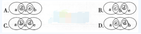 下图中的圆分别表示:a—生产者、b—分解者、c—原核生物、d—蓝藻、e—腐生细菌。能正确表示它们之间相互关系的是()。
