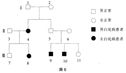 图6表示某家系中白化病发病(用A、a基因表示)情况的系谱图。 问题: (1)控制该病的基因位于_________染色体上,致病基因是_______...