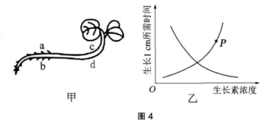 如图4中甲所示,将植物横放,根和茎生长素浓度与其生长状况的关系如图4中乙所示,曲线上P点最可能对应于图甲中的位置是()。 A.a B.b C...