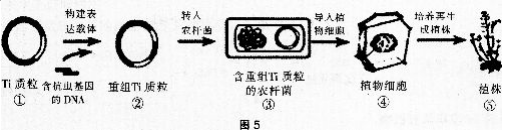 图5是利用基因工程培育抗虫植物的示意图。 (1)从④→⑤的过程,利用了______技术,该技术的原理是利用植物细胞的______性。 (2)从④→...