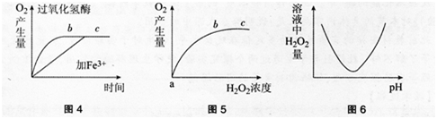 选项 A.图4可以得出酶具有高效性 B.图4bc段产生的原因可能是底物数量(浓度)有限 C.图5bc段产生的原因可能是过氧化氢酶数量(浓度)有限 D.图6可以得出pH越小或越大,酶活性越高