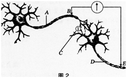 图2为某反射弧的部分结构示意图。若在B、E两点的细胞膜表面安放电极,中间接电表。据图判断下列叙述错误的是()。 A.刺激D点时将会使电表的指针发生两次摆...