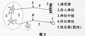 某种药物可以阻断蟾蜍屈肌反射活动。图3为该反射弧的模式图。A、B为神经纤维上的实验位点,C为突触间隙。下列实验结果中,能够证明这种药物“在神经系统中仅对神...