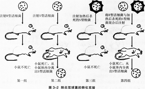 问题 “DNA是主要的遗传物质”是人民教育出版社高中《生物》必修2第三章第一节的内容。请依据所给的部分教科书内容,完成相应的教学设计。(材料见后两页) 要求: (1)对肺炎双球菌转化实验和噬菌体侵染细菌实验进行比较分析。 (2)设计一个关于本节内容的练习题,并给出详细分析。 肺炎双球菌的转化实验 通过确凿的实验证据向遗传物质是蛋白质的观点提出挑战的,首先是美国科学家艾弗里(O.Avery,1877—1955),而艾弗里的实验又是在英国科学家格里菲思(F.Griffith,1877—1941)的实验基础上进行的。1928年,格里菲思以小鼠为实验材料,研究肺炎双球菌是如何使人患肺炎的。他用两种不同类型的肺炎双球菌去感染小鼠。一种细菌的菌体有多糖类的荚膜,在培养基上形成的菌落表面光滑(smooth),叫作S型细菌;另一种细菌的菌体没有多糖类的荚膜,在培养基上形成的菌落表面粗糙(rough),叫作R型细菌。在这两种细菌中,S型细菌可以使人患肺炎或小鼠患败血症,因此是有毒性的;R型细菌不能够引发上述症状,因此是无毒性的。 格里菲思的实验过程如图3—2所示。 格里菲思从第四组实验的小鼠尸体上分离出了有毒性的S型活细菌,而且这些S型活细菌的后代也是有毒性的S型细菌.这表明无毒性的R型活细菌在与被加热杀死的S型细菌混合后,转化为有毒性的S型活细菌,而且这种性状的转化是可遗传的。于是,格里菲思推论在第四组实验中。已经被加热杀死的S型细菌中,必然含有某种促成这一转化的活性物质——“转化因子”,这种转化因子将无毒性的R型活细菌转化为有毒性的S型活细菌。 这种转化因子究竟是什么物质呢为了弄清楚转化因子,艾弗里及其同事对S型细菌中的物质进行了提纯和鉴定。他们将提纯的DNA、蛋白质和多糖等物质分别加入到培养了R型细菌的培养基中,结果发现:只有加入DNA,R型细菌才能够转化为S型细菌,并且DNA的纯度越高,转化就越有效:如果用DNA酶分解从S型活细菌中提取的DNA。就不能使R型细菌发生转化(图3—3)。