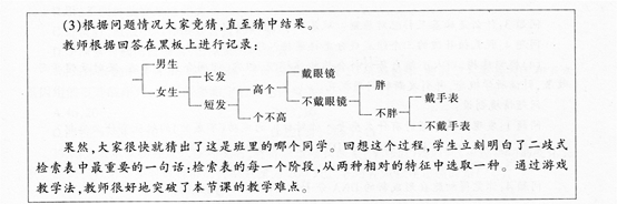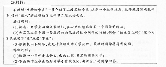 解析 (1)该游戏教学的优点: ①巧设游戏,能够激发学生的学习兴趣,引起学习动机。 ②学生通过“猜人”游戏,更易理解二歧式检索表的内容,将知识化难为易,很好地突破了教学难点。 ③提高了学生学习的积极性,学生积极主动参与到课堂学习中来。很好地体现了学生的“主体性”。 ④启发学生思维,学生“爱学、乐学、主动学”,逐渐形成正确的学习方法和良好的学习习惯。 (2)使用游戏教学时应注意以下几点: ①教师课前要做充足准备,根据教学内容的特点选择适当的游戏,游戏难易适中,贴近学生生活。本材料中教师选择“猜人”游戏,学生容易掌握又能很好地解释二歧式检索表。 ②游戏规则和要求要清晰。规则是一个游戏能否顺利有效开展下去的关键。该材料中游戏规则清晰、明了。 ③教师要关注每个学生。游戏活动能充分调动每一个学生的积极性。该材料中,全体学生都可参与其中,争先恐后提问。 ④进行科学的评价。游戏过程中和结束时教师都要给予总结和评价。教师根据“猜人”游戏,最后再次回到教学内容中来,学生对教学内容的理解更透彻.
