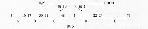 问题 蛋白酶1作用于苯丙氨酸(C9H11NO2)羧基端的肽键,蛋白酶2作用于赖氨酸(C6H14N2O2)两侧的肽键,某四十九肽经酶1和酶2作用后的情况如图2,下列叙述正确的是()。