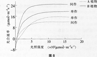问题 A、B两种植物分别单独种植(单作)或两种隔行种植(间作),测得相应的光合速率如图8所示。
