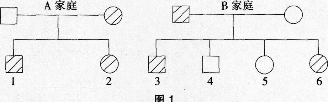 图1是A、B两个家庭的色盲遗传系谱图,A家庭的母亲是色盲患者(图中 ),这两个家庭由于某种原因调换了一个孩子,请确定调换的两个孩子是()。 ...