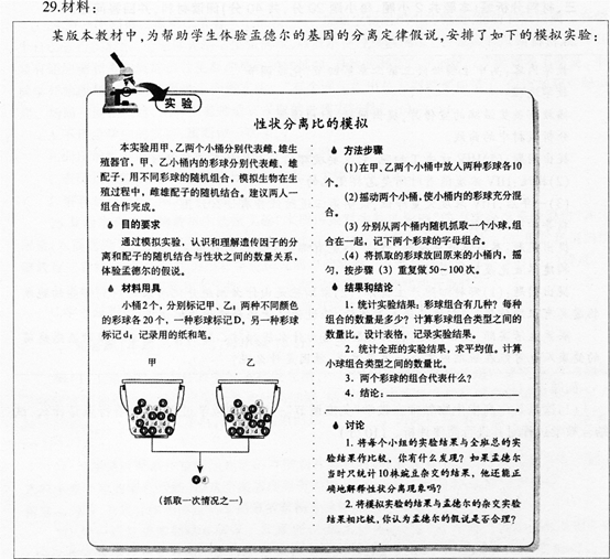解析 (1)实验原理:根据孟德尔对分离现象的解释,生物的性状是由遗传因子(基因)决定的,控制显性性状的基因为显性基因(用大写字母表示如D),控制隐性性状的基因为隐性基因(用小写字母表示如d),而且基因成对存在。遗传因子组成相同的个体为纯合子,不同的为杂合子。生物形成生殖细胞(配子)时成对的基因分离,分别进入不同的配子中。当杂合子自交时,雌雄配子随机结合,后代出现性状分离,性状分离比为显性:隐性=3:1。用甲、乙两个小桶分别代表雌、雄生殖器官,甲、乙两小桶内的彩球分别代表雌雄配子.用不同彩球的随机结合,模拟生物在生殖过程中雌雄配子的随机组合。(2)实验步骤: ①全班同学分小组,每小组进行合作探究实验。②每个小组可以领取2个小桶和40个小球(黄、白各20个),然后每个小桶放置20个小球(黄、白各l0个)。③每个小组安排3个同学(甲、乙、丙),甲负责从两个小桶中随机各抓取1个小球进行组合,乙负责统计实验数据,丙负责把抓取的小球放回原处。④每个小组抓取的次数在50~100次之间,完成任务之后,小组长负责把本小组的实验数据向班级汇报(把实验数据填写到指定表格上)。⑤所有小组都完成任务后,把各个小组的实验数据进行汇总并计算平均值,得出最终数据。⑥分析结果、得出结论:F1自交得到F2,F2中会出现性状分离,性状分离比为3:1。实验重复的次数越多,实验结果越准确。 注意事项:负责抓取小球的同学(甲)要求先闭上眼睛,然后才可以实施抓取任务:负责把小球放回原处的同学(丙),要留意每个小球原来的位置,不能放错地方;负责统计数据的同学(乙)要认真观察甲每次抓取小球的组合情况,并如实记录.不能主观更改实验数据。