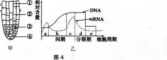 据图回答(1)~(3)题。 图4中甲表示洋葱根尖的不同区域,乙表示洋葱根尖处于有丝分裂各阶段细胞核中DNA和细胞质中mRNA的含量变化。 ...