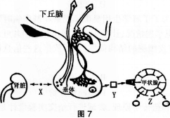 高等动物某些生命活动的调节如图7所示,X、Y、Z为激素,回答: (1)若用微电极刺激下丘脑,垂体的分泌活动 __________ ,若用微...