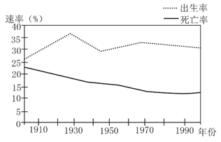 下图是某地居民在1900~2000年的出生率和死亡率的曲线图,在此期间没有明显迁入和迁出的活动,据此推断该地区人口数量在这一时期的变化趋势为( )。 ...