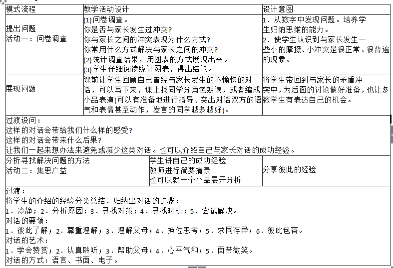 解析 (1)教学目标 情感、态度与价值观目标:对父母亲人的爱;对自己正确行为的赞赏,对错误行为的后悔和反省:对父母的尊重,对自己人格的维护;崇尚与父母的平等,与父母共同遵守道德和法律准则;体会父母对自己的心情和期待,正确对待父母教育的情感;坚持正确的看法和行为,丢掉不良思想行为的态度。 能力目标:掌握与父母沟通商量的能力以及对多种可能解决问题的方式进行选择的能力:培养与父母交往的诸多策略的应用能力,锻炼家庭交往中得失利弊的权衡能力。 知识目标:知道与父母沟通的过程;掌握与父母沟通的基本要领和主要策略:以宽大胸怀和积极态度与父母交往;不必非争高下输赢不可。 (2)活动方案