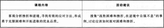 解析 (1)课程内容中,“客观分析挫折和逆境,寻找有效的应对方法,养成勇于克服困难和开拓进取的优良品质。”是为了让学生正确地面对遇到的挫折和逆境,遇到困难要勇敢面对,不要气馁,并且能够克服,能培养学生乐观向上、意志坚强的人生态度。(6分) (2)活动建议中,搜集“战胜困难和挫折”的事例.学生在这个过程中可以了解一些战胜困难的人和事,感受到生命的可贵:在讨论如何面对困难和挫折过程中,学生可以找到战胜挫折和逆境的方法.从而增加自信、自尊,明白困难可以战胜,养成乐观积极的态度。(6分)
