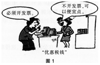 解析 本题为漫画题,考查的是税收的相关知识。漫画中的经营者企图通过“便宜”不给消费者开发票,这种行为属于纳税人有意违反税法规定,少缴应纳税款的行为,是偷税行为。发票是营业依据.不开发票会减少经营者的税赋负担,减少国家税收收入。
