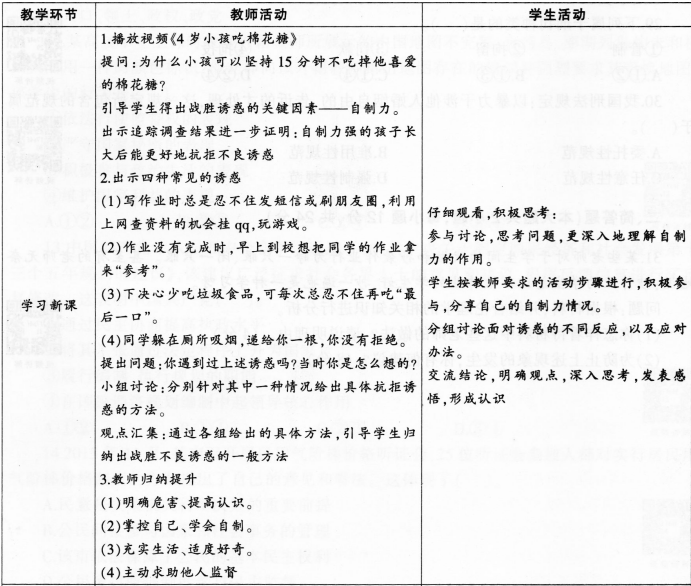 解析 思想品德课程是一门以初中生生活为基础、以引导和促进初中学生思想品德发展为根本目的的综合性课程,思想品德教师在设计课堂教学时需要贯彻这一思想。该教学片段值得我们借鉴的地方有以下三个方面。 (1)帮助学生过积极健康的生活,做负责任的公民。初中学生正处于身心发展的重要时期,自我意识和独立性逐步增强。在初中阶段帮助学生形成良好的品德.树立责任意识和积极的生活态度.对学生的成长具有基础性的作用。思想品德课程的任务是引领学生了解社会、参与公共生活、珍爱生命、感悟人生,逐步形成基本的是非、善恶和美丑观念,过积极健康的生活,做负责任的公民。在总结深化环节,通过名人名言的解读分析,以及学生之间的相互交流和感悟,进行分享活动,正是帮助学生了解社会,参与生活并感悟人生的体现;在拓展思考环节.带领学生签下承诺书,正是帮助学生做负责任公民的体现。 (2)初中生逐步扩展的生活是课程的基础。思想品德是人在对生活的认识、体验和实践过程中逐步形成的。初中学生生活范围逐渐扩展,需要处理的各种关系日益增多。思想品德课程正是在学生逐步扩展的生活经验的基础上,与他们一起体会成长的美好、面对成长中的问题,为初中学生正确认识成长中的自己,处理好与他人、集体、国家和社会的关系,提供必要的帮助。在学习新课环节,教师通过播放《4岁小孩吃棉花糖》的视频,以及出示生活中四种常见的不良诱惑,帮助初中生认清生活中的不良诱惑。在初中生逐步扩展的生活经验的基础上,与学生一起面对成长的问题,并提供必要的帮助,学生在这样的活动中也积极参与。在拓展思考环节,教师带领学生结合自己的实际情况,写一则承诺书,也正是基于学生的生活而展开。 (3)坚持正确价值观念的引导与学生独立思考、积极实践相统一是课程的基本原则。思想品德的形成与发展.离不开学生的独立思考和积极实践,国家和社会的要求只有通过学生的独立思考与实践才能为学生真正接受。思想品德课程将正确的价值观引导蕴涵在鲜明的生活主题之中,注重课内课外相结合,鼓励学生在实践中进行积极探究和体验,通过道德践行促进思想品德的健康发展。在整个课堂教学活动中,教师都是在正确的价值观下去引导学生参与课堂,积极引导学生独立思考,之后又对学生进行分组,给出体验题目,引导学生积极参与讨论,并和同学进行分享,正是这一理念的体现。