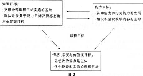 材料:《普通高中思想政治课程标准(实验)》从知识、能力、情感态度与价值观三个维度表达课程目标.三者之间的关系可以用图3表示。 简述图3所反...