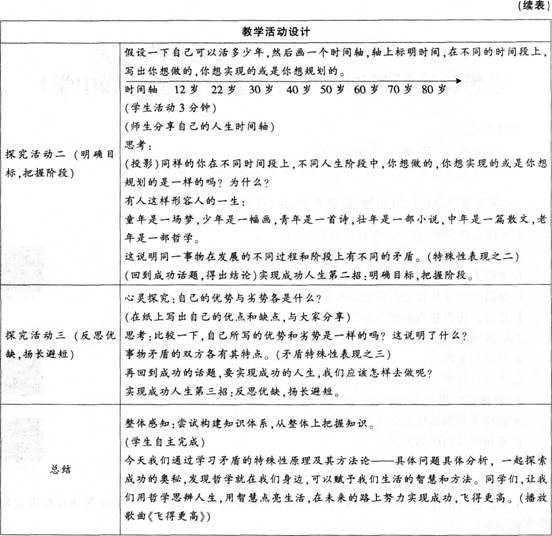 解析 (1)高中思想政治课程倡导“加强思想政治方向的引导与注重学生成长特点相结合”的理念,要重视高中学生在心理、智力、体能等方面的发展潜力,针对其思想活动的多变性、可塑性等特点,在尊重学生个性差异和各种生活关切的同时,恰当地采取释疑解惑、循循善诱的方式,帮助他们认同正确的价值标准、把握正确的政治方向。 (2)本教学设计体现了“加强思想政治方向的引导与注重学生成长特点相结合”的理念。在探究活动二中。教师让学生写出自己在人生的每一时间段上想做的事情,这就结合了学生自己的发展规划.以及自己在不同人生阶段上的个性特点,体现了“注重学生成长特点”的理念。 教师之后又引导学生“童年是一场梦,少年是一幅画,青年是一首诗,壮年是一部小说,中年是一篇散文.老年是一部哲学”,并得出结论——实现成功人生第二招:明确目标,把握阶段。这一引导的过程具有正面带动意义。“明确目标,把握阶段”,这是对学生成功的正确引导,有利于他们坚持正确的人生方向,体现了“加强思想政治方向的引导”这一理念,这样一个探究过程就能够把加强思想政治方向的引导与注重学生成长特点结合起来。 探究活动三中,教师让学生找出自己的优势和劣势,这就结合了学生自己的个性特点。体现“注重学生成长特点”,之后引导实现成功的第三招:反思优缺,扬长避短,对于学生的成长起到了正面的引导,给学生指明了正确的方向,这一过程也体现了“加强思想政治方向的引导与注重学生成长特点相结合”的理念。