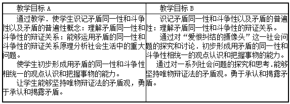 下面是某老师为《矛盾是事物发展的源泉》一课设计的教学目标。 问题:根据思想政治新课程的基本理论比较教学目标A、B的异同。